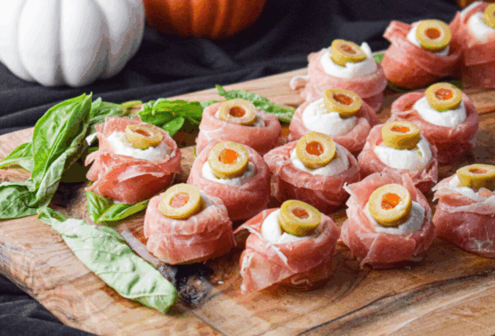 Put a spooky twist on classic antipasto with “eyeballs” made from mozzarella balls wrapped in prosciutto and topped with green olive centers. The salty prosciutto, creamy mozzarella, and briny olives create a deliciously balanced bite, while the eye-like presentation adds fun and flair to your Halloween charcuterie board.