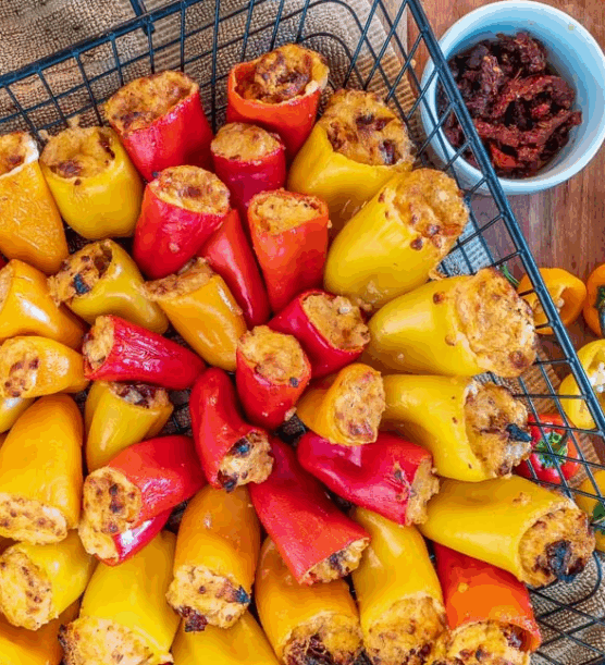 Colorful mini sweet peppers take on a spooky twist as “monster fingers,” filled with creamy, savory cheese for a fun and festive snack. The crisp peppers paired with smooth, flavorful filling create a satisfying bite, while simple details like almond “fingernails” or olive slices bring the monsters to life.