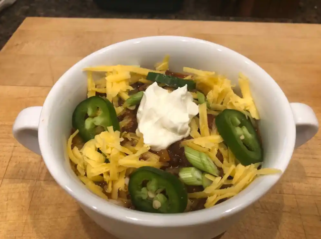 This is chili in its purest form – just beef, tomatoes, and spices, the way Texas intended. Large chunks of beef chuck roast become melt-in-your-mouth tender while developing deep, rich flavors. The spice blend is bold but balanced, with plenty of heat that builds gradually.
