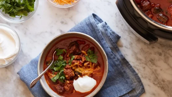 This hearty chili is packed with flavor and ready in a fraction of the time traditional chili takes. The meat is tender, the spices are perfectly balanced, and it’s thick and satisfying without any beans. It’s ideal for casual Christmas Eve gatherings or feeding a crowd on a budget.
