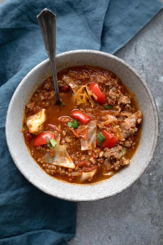 All the flavors of traditional cabbage rolls without all the rolling and stuffing work. Ground beef, cabbage, and tomatoes simmer together in a savory broth with Eastern European spices. It’s incredibly budget-friendly and makes a huge batch perfect for feeding large holiday gatherings. The flavors deepen overnight, making leftovers even more delicious.