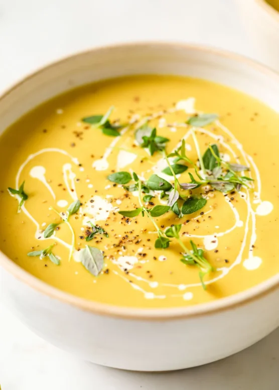 While butternut squash is higher in carbs, this recipe uses it sparingly with cauliflower as a base to keep portions reasonable. The natural sweetness pairs beautifully with warming spices like cinnamon and nutmeg. It’s smooth, velvety, and feels like a warm hug in a bowl. The festive orange color makes it perfect for holiday tables.