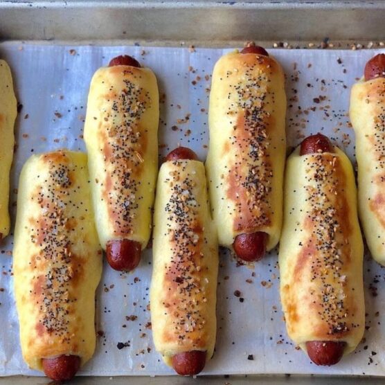 Classic pigs in a blanket go keto with a low-carb fathead dough wrapper around sugar-free hot dogs. The dough bakes up golden and slightly chewy, just like traditional pastry but without the carbs.