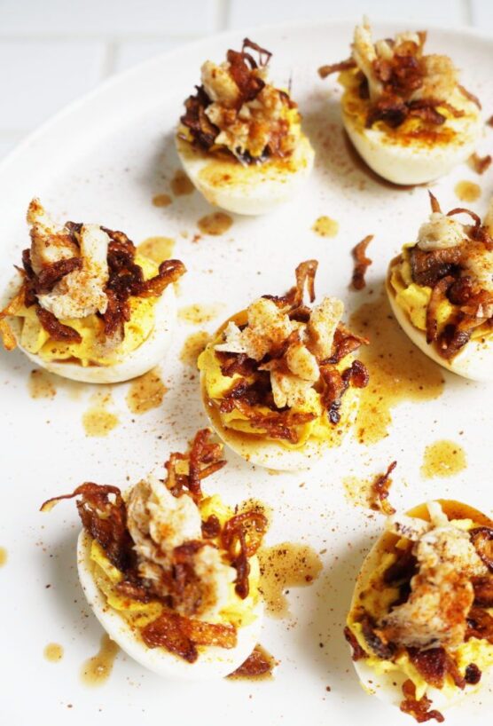 Deviled eggs get a spooky makeover with orange yolk filling and black olive decorations to create various Halloween characters. The filling tastes like traditional deviled eggs but with added paprika for that orange color.