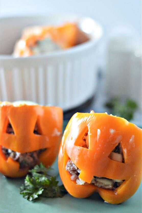 7. Orange Bell Pepper Stuffed “Jack-o’-Lantern Faces”