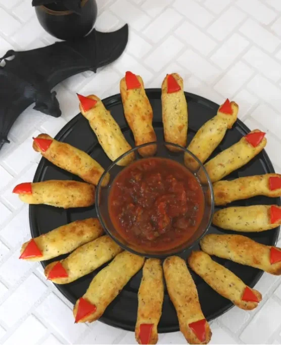 These spooky ‘Witch Fingers’ are a fun and crunchy appetizer that’s perfect for Halloween dinners. Made from almond flour and mozzarella, they stay soft inside but crisp up beautifully on the outside. Each “finger” is shaped by hand and topped with a slice of red bell pepper as a “fingernail,” giving them a realistic, eerie look.