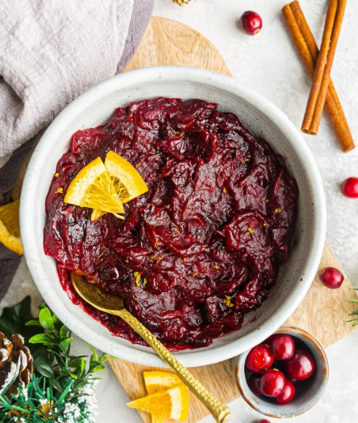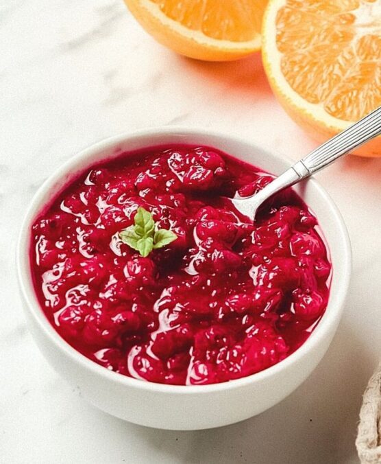 If you love that fresh, zingy cranberry relish that’s more chunky than saucy, this one’s for you. It’s completely raw, so you just pulse everything in a food processor and you’re done in five minutes flat. The combination of tart cranberries and sweet orange creates this vibrant, refreshing condiment that cuts through rich turkey and gravy perfectly. Plus, the bright ruby color looks gorgeous on your holiday table.