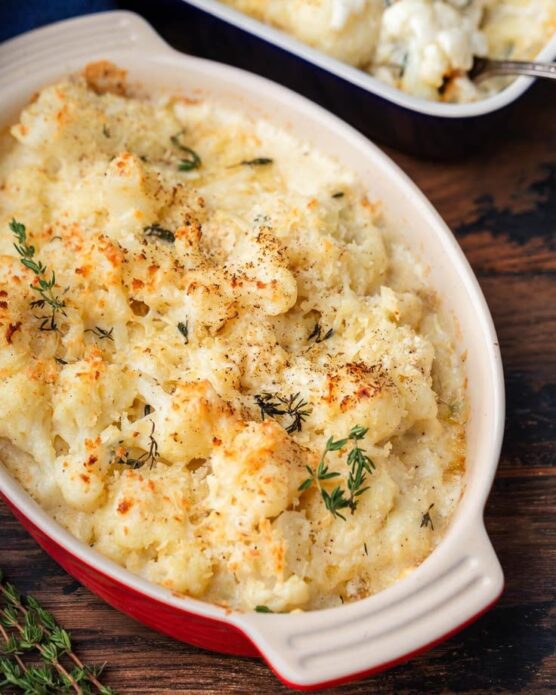 Tender cauliflower florets swimming in a rich, cheesy cream sauce that bubbles and browns beautifully on top. The cauliflower becomes incredibly creamy and absorbs all the flavors while maintaining just enough texture to be interesting.