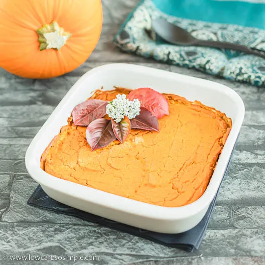 All the warm spices and cozy flavors of traditional pumpkin casserole, but made with cauliflower and real pumpkin puree for fewer carbs. The cauliflower base becomes incredibly creamy and takes on the pumpkin flavor beautifully.