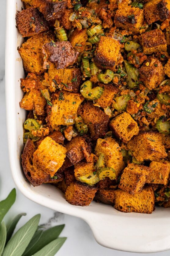 Earthy mushrooms and celery root create a sophisticated stuffing that’s rich in umami flavors. The celery root provides bulk and a subtle celery taste, while mushrooms add meaty texture and depth. This combination feels very grown-up and elegant, perfect for impressing dinner guests. It’s relatively quick to prepare and develops wonderful caramelized flavors as it bakes. The natural savory qualities mean it pairs exceptionally well with roasted turkey and other traditional sides.
